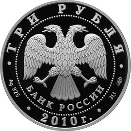 Center: Bank of Russia emblem (two-headed eagle, wings down, with "БАНК РОССИИ" below), within a dotted circle. Rim inscriptions: top - "ТРИ РУБЛЯ"; bottom left - metal and fineness; center - "2010 г."; bottom right - metal content and mint mark.