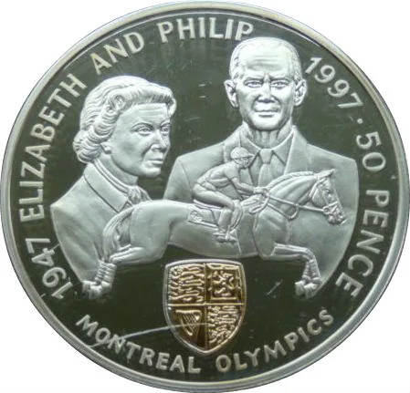 Queen Elizabeth II and Prince Philip with a show jumper and golden shield.