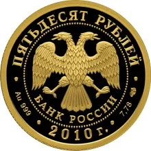 Center: Bank of Russia emblem (two-headed eagle, wings down, with "БАНК РОССИИ" below), circled by dots. Rim inscriptions: top - "ПЯТЬДЕСЯТ РУБЛЕЙ"; bottom left - metal and fineness, center - "2010 г.", right - metal content and mint mark.