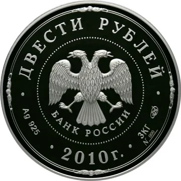Center: Bank of Russia emblem (two-headed eagle with wings down, "БАНК РОССИИ") within a dotted circle. Above: "ДВЕСТИ РУБЛЕЙ". Below left: metal and fineness; center: year "2010 г."; right: fine weight, mint mark, and serial number №___. Rim: two lines with four decorative elements.