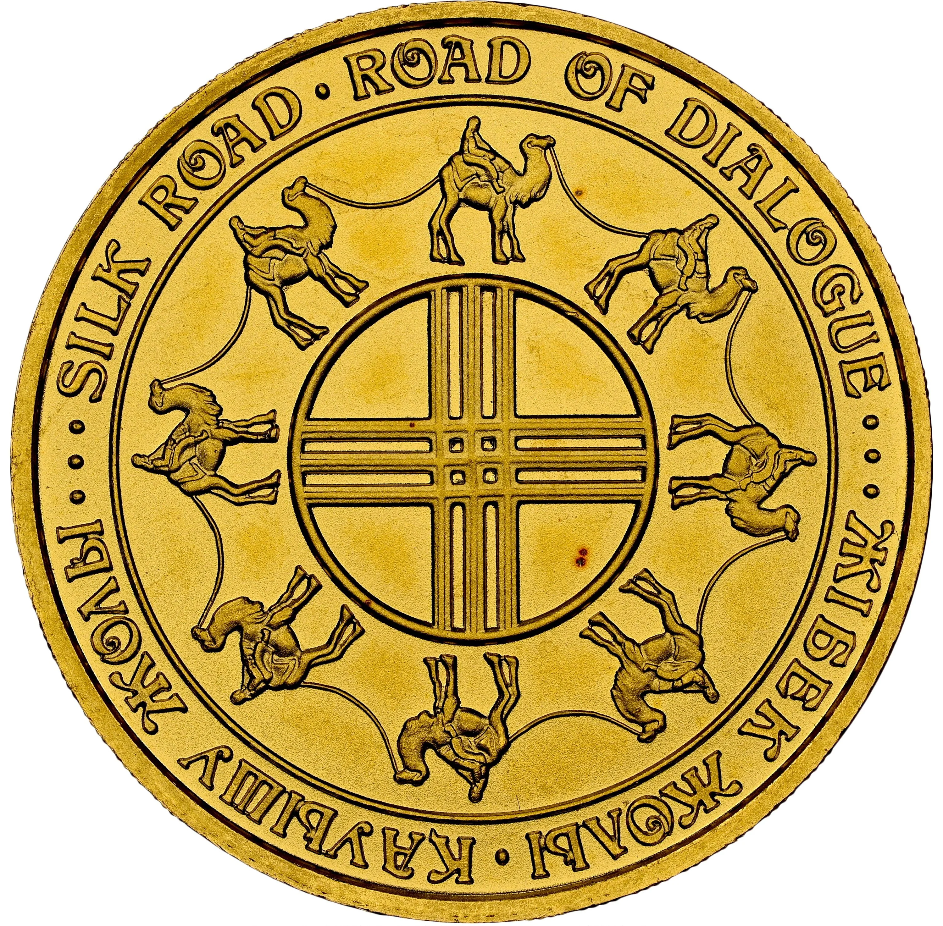 The shanyrak (yurt roof) symbolizes the Silk Road through a camel caravan, representing connection and dialogue between nations. Encircled text reads: "ЖІБЕК ЖОЛЫ. ҚАУЫШУ ЖОЛЫ... SILK ROAD. ROAD OF DIALOGUE."