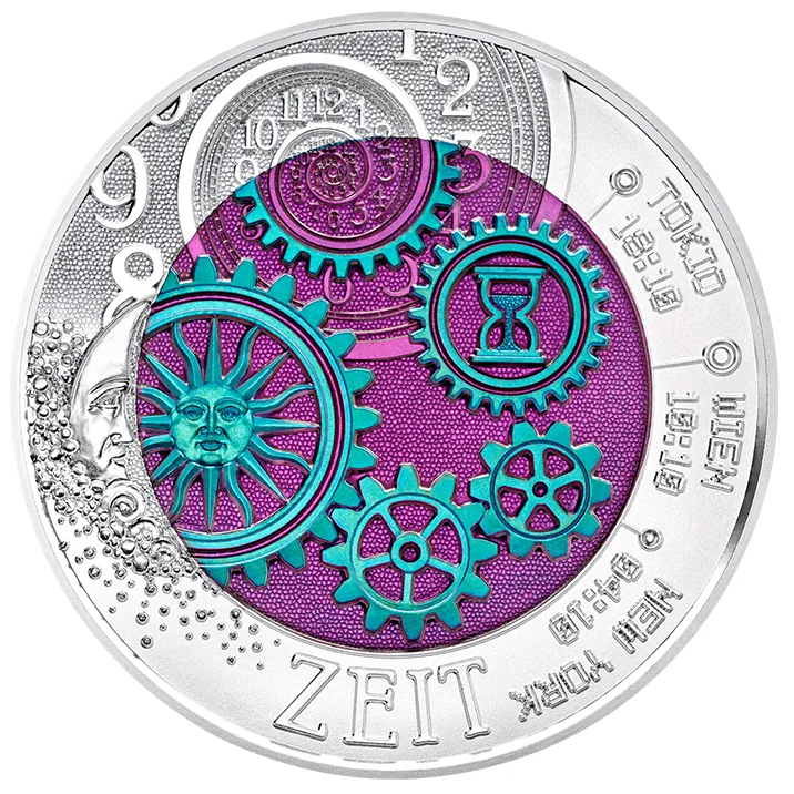Clockwork with time symbols: hourglass, sun, moon, spiral.