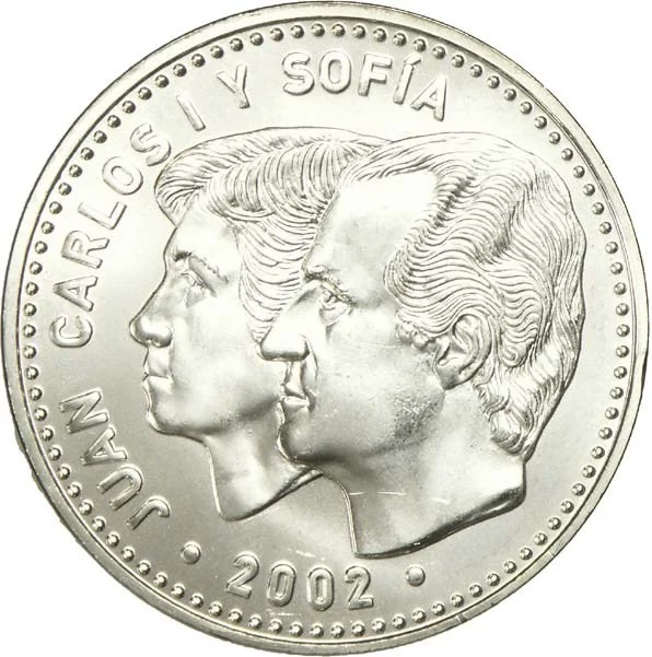 Juan Carlos I and Sofía facing left. Names left. Date below.