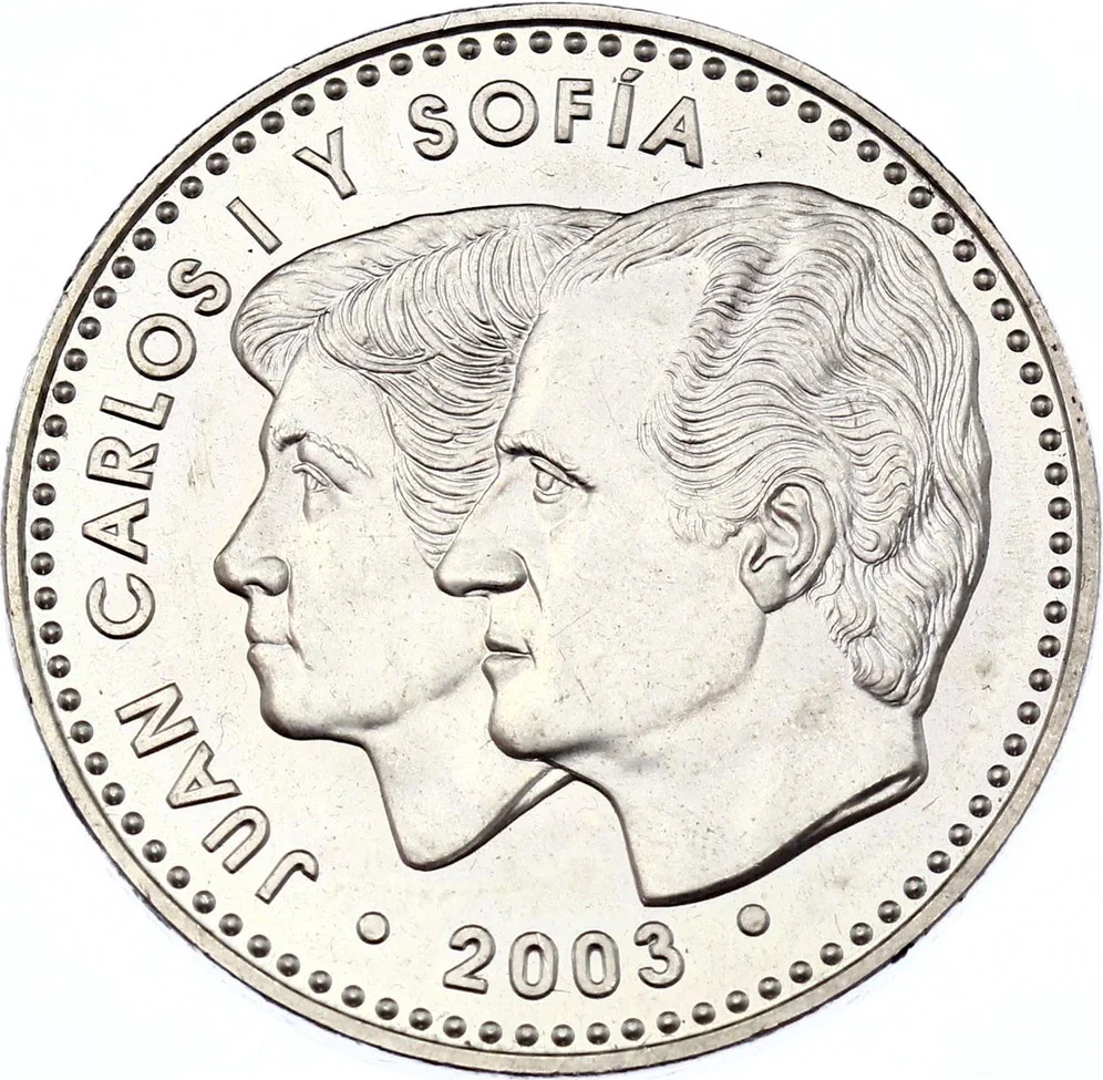 Conjoined heads of King Juan Carlos I and Queen Sofía, facing left.