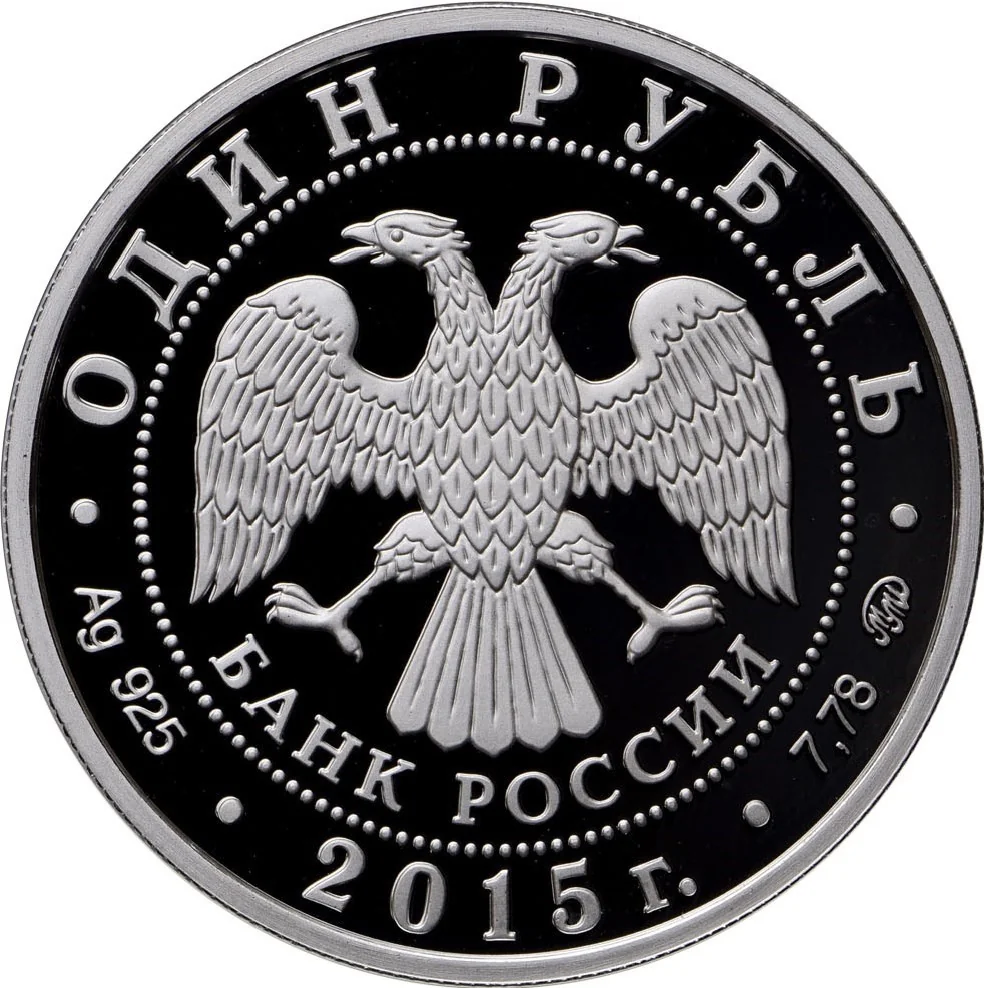 The central Bank of Russia emblem is encircled by dots. The rim inscriptions read "ONE ROUBLE" above, and below: the metal/fineness on the left, "2015" in the center, and the metal content/mint mark on the right.