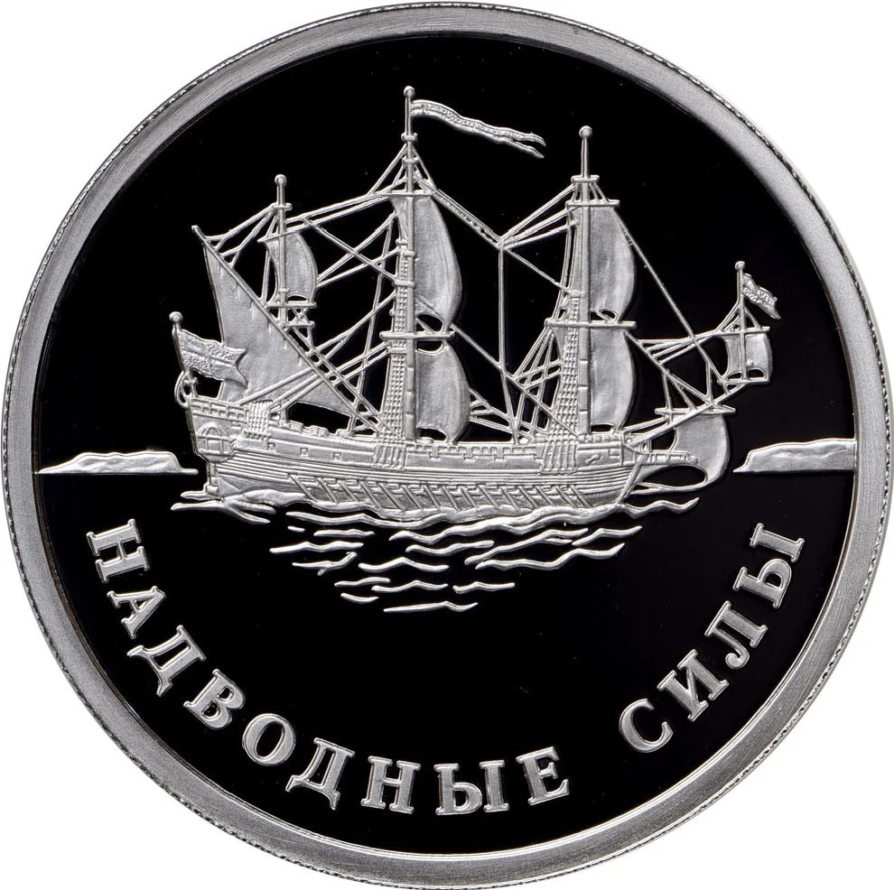 A three-master ship on a mirrored field, encircled by "НАДВОДНЫЕ СИЛЫ" (SURFACE FLEET).