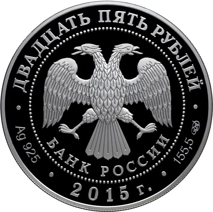 Center: Bank of Russia emblem (two-headed eagle with wings down, "БАНК РОССИИ" below), circled by dots. Rim inscriptions: top – "ДВАДЦАТЬ ПЯТЬ РУБЛЕЙ"; bottom left – metal and fineness, center – "2015 г.", right – metal content and mint mark.
