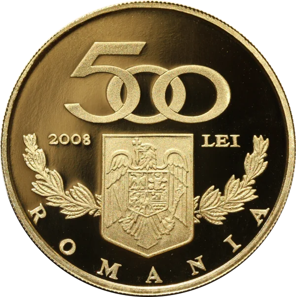 500 LEI, issued 2008, featuring Romania's coat-of-arms between laurel branches and "ROMANIA".