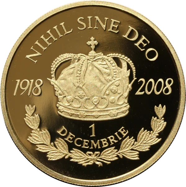 "NIHIL SINE DEO," Romania's steel crown, the years 1918 and 2008, "1 DECEMBRIE," and a laurel garland.