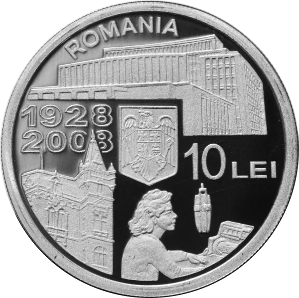 Center: Years "1928 2008", Romania's coat of arms, and the face value "10 LEI".
