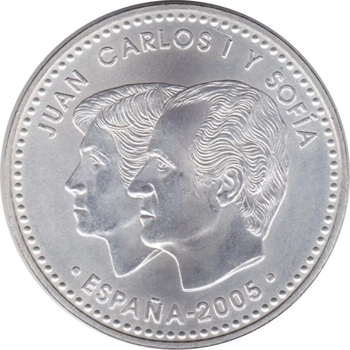 Conjoined heads of King Juan Carlos I and Queen Sofía, facing left.