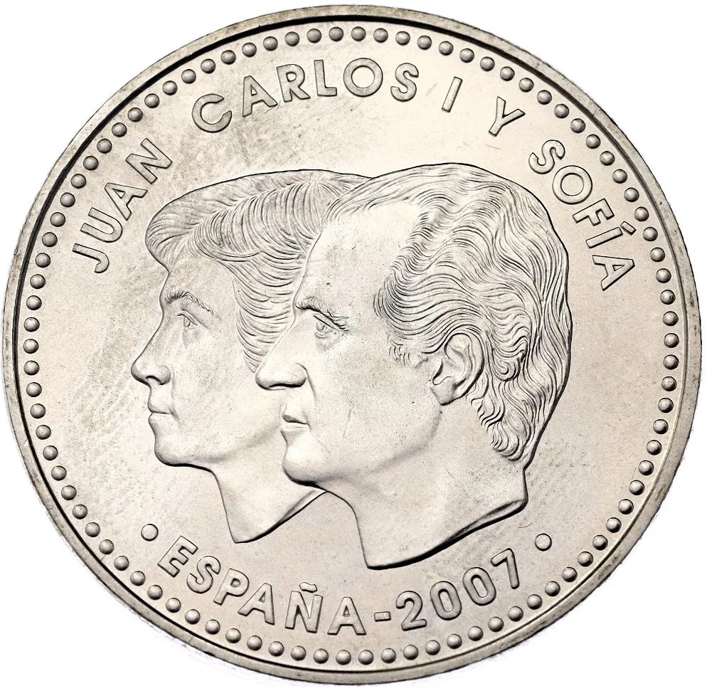 Conjoined heads of King Juan Carlos I and Queen Sofía, facing left.
