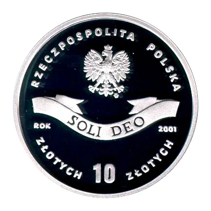 Poland's State Eagle emblem with "RZECZPOSPOLITA POLSKA" above. Below, inscriptions: "SOLI DEO" on a ribbon, "ROK 2001", and "ZŁOTYCH 10 ZŁOTYCH". Mint mark "m/w" under the Eagle's left talon.