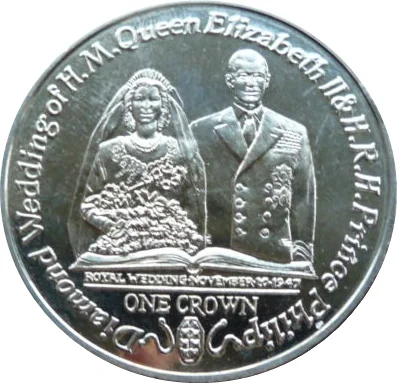 Conjoined busts of Elizabeth II and Prince Philip facing right, encircled by legend and date.