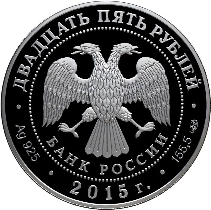 Center: Bank of Russia emblem (two-headed eagle with wings down, "БАНК РОССИИ" below), circled by dots. Rim inscriptions: top – "ДВАДЦАТЬ ПЯТЬ РУБЛЕЙ"; bottom left – metal and fineness, center – "2015 г.", right – metal content and mint mark.