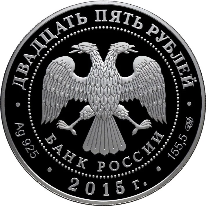 Center: Bank of Russia emblem (two-headed eagle with wings down, "БАНК РОССИИ" below), circled by dots. Rim inscriptions: top – "ДВАДЦАТЬ ПЯТЬ РУБЛЕЙ"; bottom left – metal and fineness, center – "2015 г.", right – metal content and mint mark.