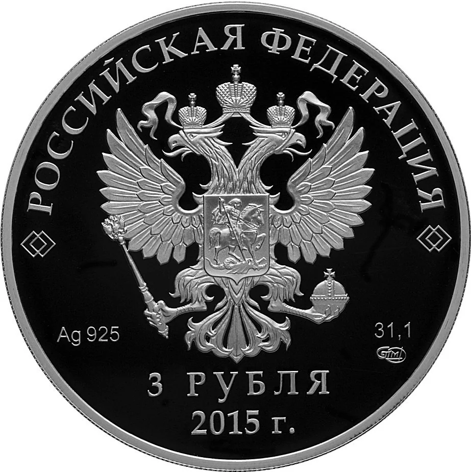 Central: National Coat of Arms. Above, along rim: "РОССИЙСКАЯ ФЕДЕРАЦИЯ". Below arms: left – metal and fineness, right – fine metal content and mint mark. Below in two lines: "3 РУБЛЯ" and "2015 г.".