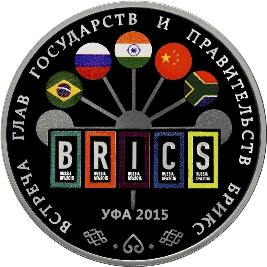 The center features the BRICS logo above "УФА 2015" and below a Bashkortostan kurai flower adorned with the five BRICS national flags. Around the rim is the inscription: "ВСТРЕЧА ГЛАВ ГОСУДАРСТВ И ПРАВИТЕЛЬСТВ БРИКС".