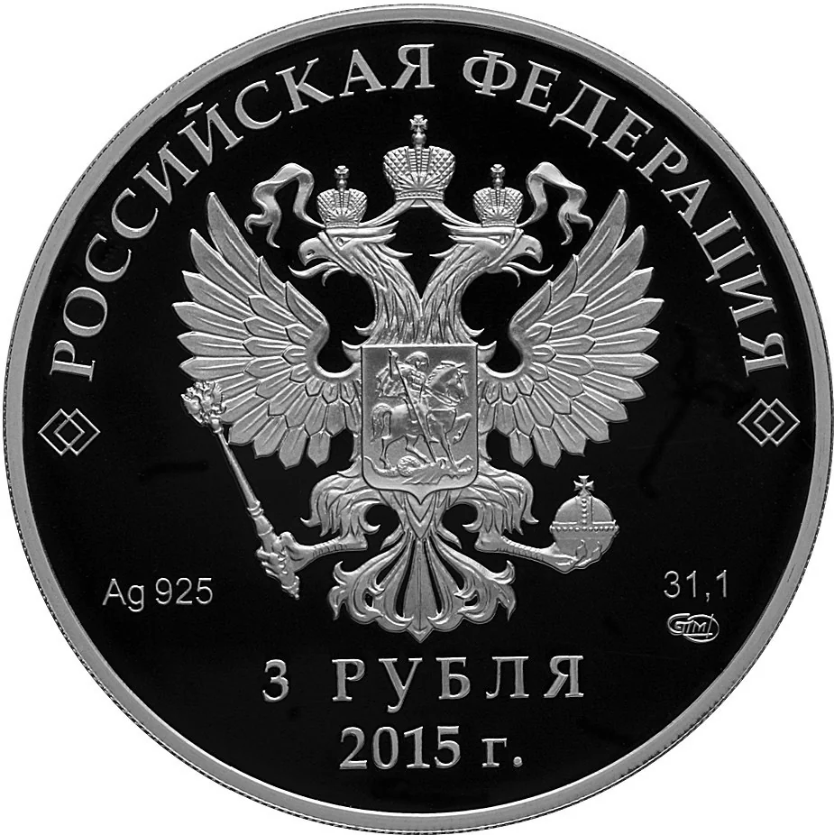 Central: National Coat of Arms. Above, along rim: "РОССИЙСКАЯ ФЕДЕРАЦИЯ". Below arms: left – metal and fineness, right – fine metal content and mint mark. Below in two lines: "3 РУБЛЯ" and "2015 г.".