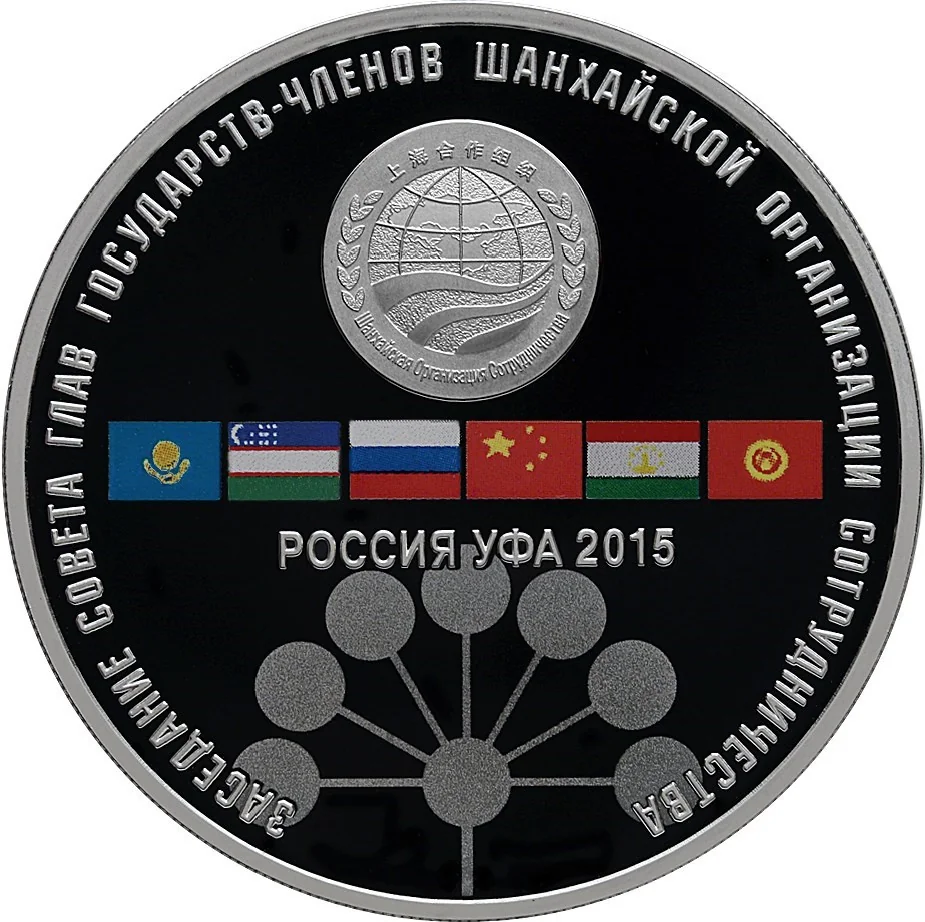 Centered on the disc is the SCO emblem above a row of six member-state flags, under which is "РОССИЯ УФА 2015". Below this is the Bashkortostan kurai flower. Around the rim is the inscription: "ЗАСЕДАНИЕ СОВЕТА ГЛАВ ГОСУДАРСТВ – ЧЛЕНОВ ШАНХАЙСКОЙ ОРГАНИЗАЦИИ СОТРУДНИЧЕСТВА".