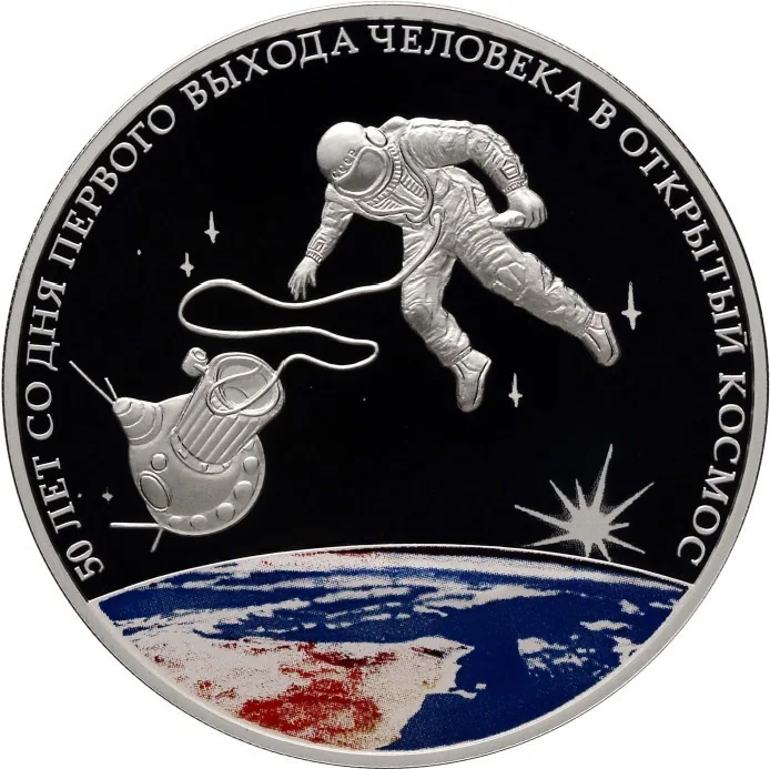 On the disc's mirror field: a relief of an astronaut tethered to a spacecraft. Above, the rim inscription: "50 ЛЕТ СО ДНЯ ПЕРВОГО ВЫХОДА ЧЕЛОВЕКА В ОТКРЫТЫЙ КОСМОС". Below, a colored image of Earth with a bright celestial body to its upper right.