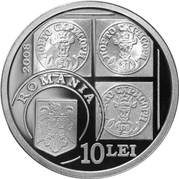 Upper right: "Bull's Head" stamps (54, 81, 108 para) within a corner design. Lower left: Romania's coat-of-arms in a double-circle seal overlapping the stamps, with "ROMANIA" inscribed above it. Left: "2008" vertically. Bottom: "10 LEI".