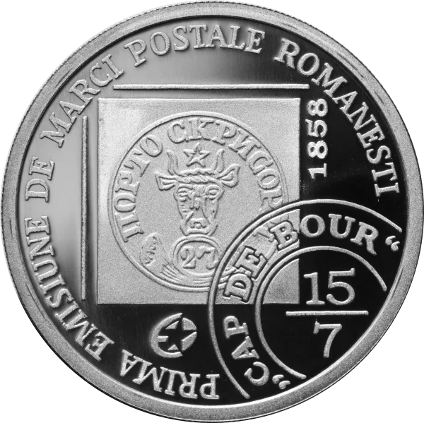 A 27-parale "Bull Head" stamp on an envelope, inscribed "CAP DE BOUR" and dated 15/7. Above: 1858. Below: the Europa star symbol. Edge inscription: "PRIMA EMISIUNE DE MARCI POSTALE ROMANESTI".