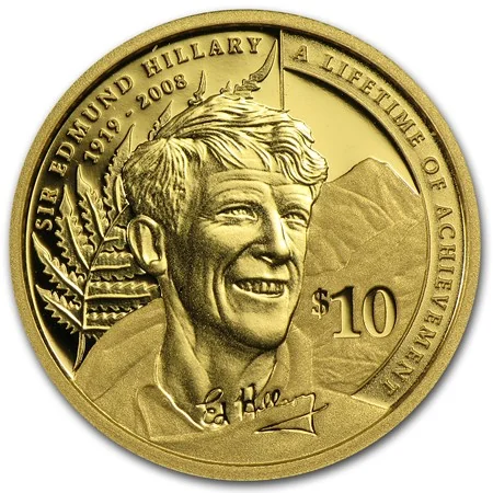 Sir Edmund Hillary's portrait with a fern left, Mt. Everest right, his signature and a $10 note below.