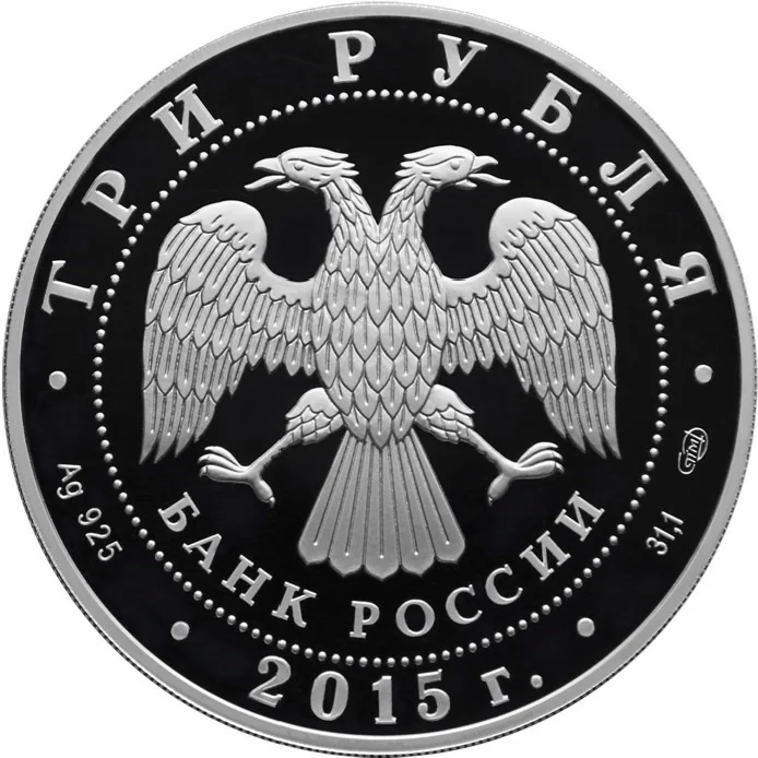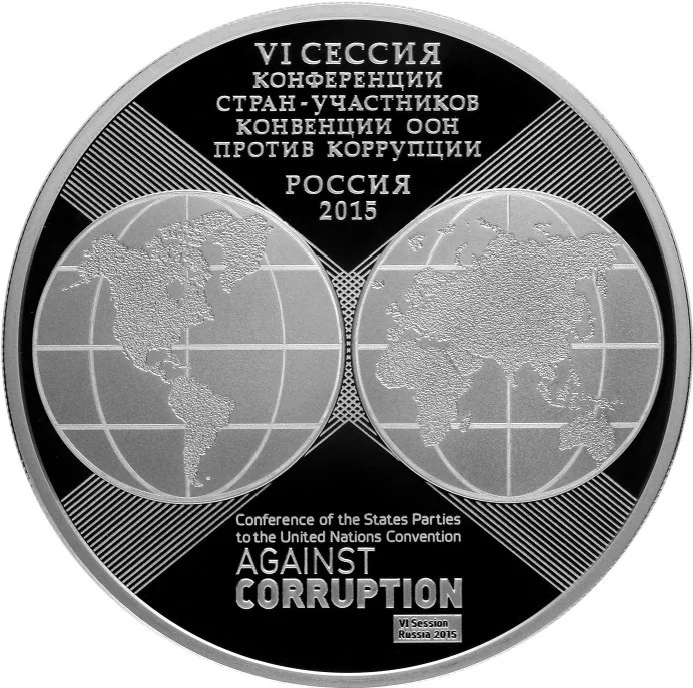 Description: On the disc's mirrored center, two thin lines cross, forming a globe image. Above it: "VI СЕССИЯ КОНФЕРЕНЦИИ СТРАН-УЧАСТНИКОВ КОНВЕНЦИИ ООН ПРОТИВ КОРРУПЦИИ РОССИЯ 2015". Below: "CONFERENCE OF THE STATES PARTIES TO THE UNITED NATIONS CONVENTION AGAINST CORRUPTION" and, on a light rectangle, "VI Session Russia 2015".