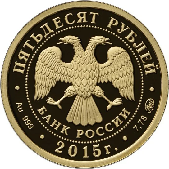 Center: The Bank of Russia emblem (two-headed eagle with the inscription "БАНК РОССИИ") within a dotted circle. Rim: Top – "ПЯТЬДЕСЯТ РУБЛЕЙ"; bottom left – metal and fineness; center – "2015 г."; bottom right – metal content and mint mark.