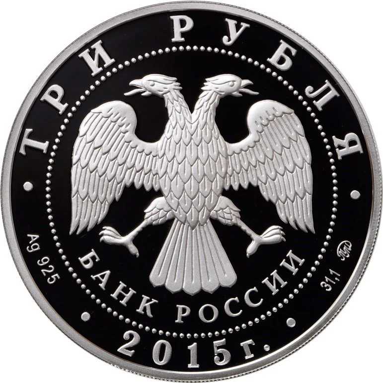 Center: Bank of Russia emblem (two-headed eagle, "БАНК РОССИИ"), circled by dots. Rim inscriptions: top – "ТРИ РУБЛЯ"; bottom left – metal and fineness; center – "2015 г."; bottom right – metal content and mint mark.