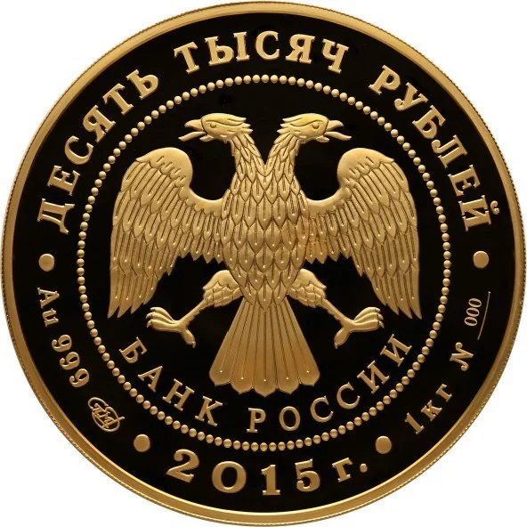 Center: Bank of Russia emblem (two-headed eagle, wings down, with "БАНК РОССИИ" below), within a dotted circle. Rim inscription: top – "ДЕСЯТЬ ТЫСЯЧ РУБЛЕЙ"; bottom – left: metal/fineness/mint mark, center: "2015 г.", right: fine weight and serial number №____.