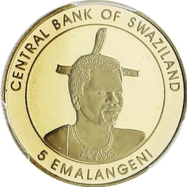 King Mswati III portrait, 3/4 right in center, with legend above and face value below.