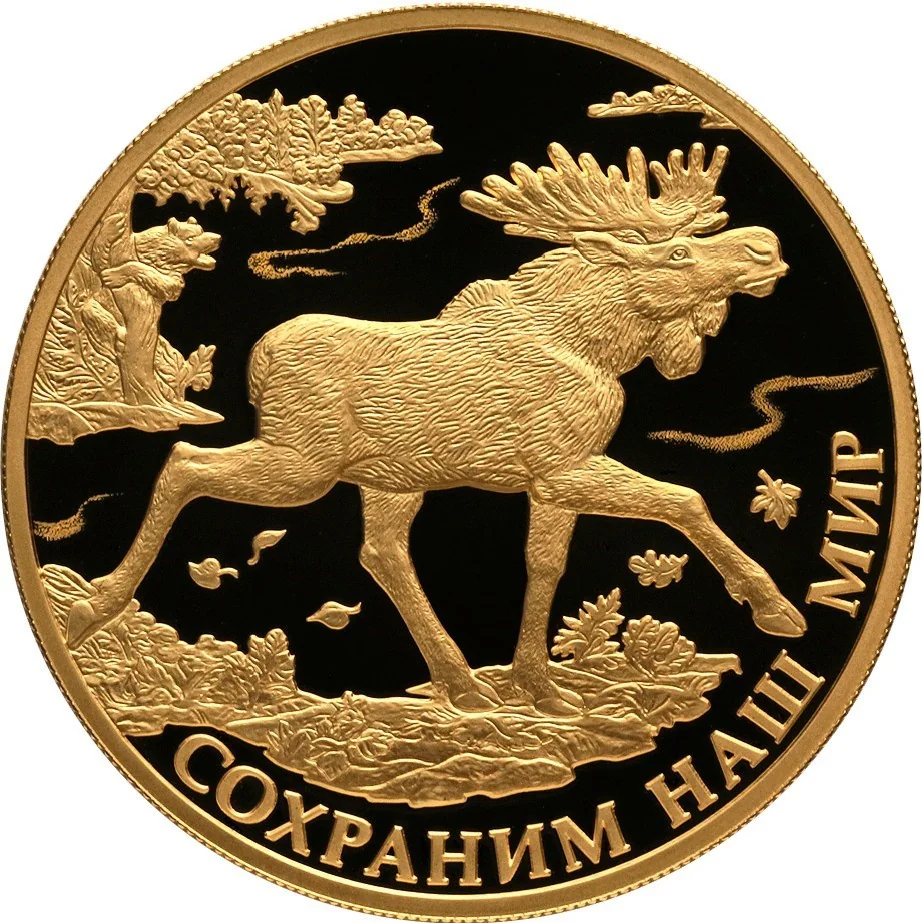 A running elk in a forest landscape is embossed on the mirror field. Below, along the rim, is the inscription: "СОХРАНИМ НАШ МИР" (PROTECT OUR WORLD).