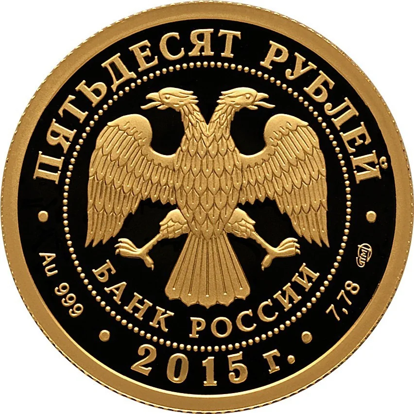 Center: The Bank of Russia emblem (two-headed eagle with the inscription "БАНК РОССИИ") within a dotted circle. Rim: Top – "ПЯТЬДЕСЯТ РУБЛЕЙ"; bottom left – metal and fineness; center – "2015 г."; bottom right – metal content and mint mark.
