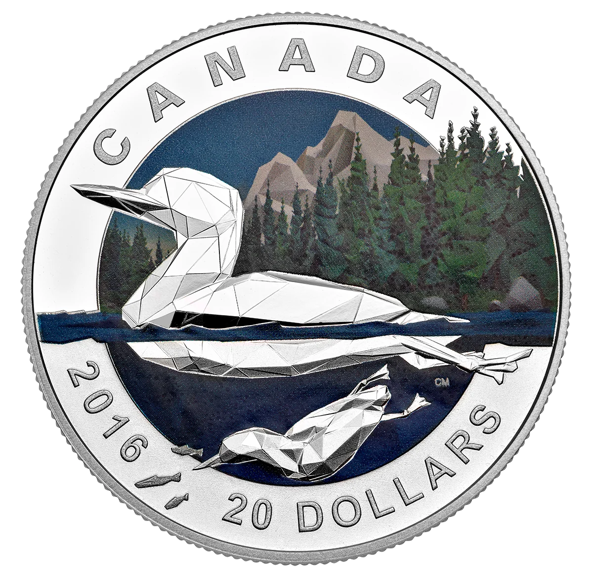 A colorful poly-art loon on a lake, her chick diving in the foreground, with mountains and trees behind. Date and value marked below.