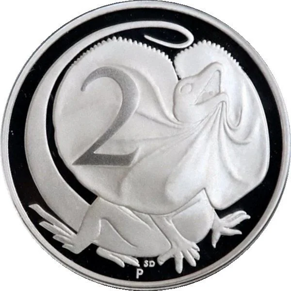 Australian 2 cent coin replica (KM# 63), featuring the Frilled Neck Lizard (Frilled Dragon).