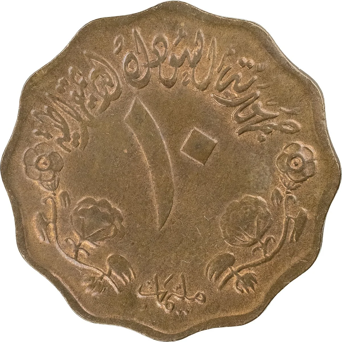 Cotton sprigs flank an Arabic inscription above and below.