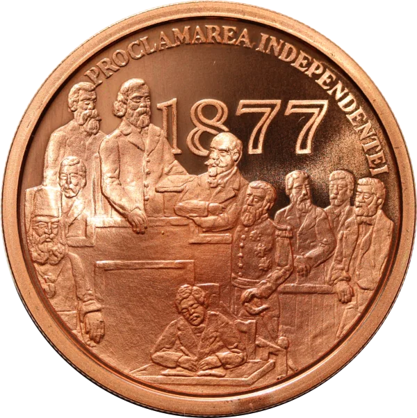 A scene of the Romanian Parliament proclaiming independence; above, the year 1877; circular inscription "PROCLAMAREA INDEPENDENTEI".