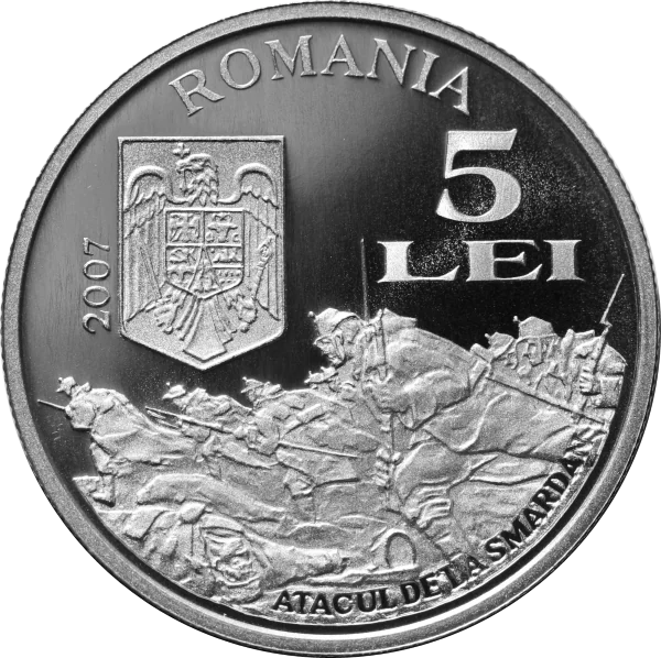 Lower half: detail from Grigorescu's "The Smârdan Assault." Upper half: 5 LEI, Romania's coat of arms, 2007, and circular inscriptions "ROMANIA" and "ATACUL DE LA SMARDAN."