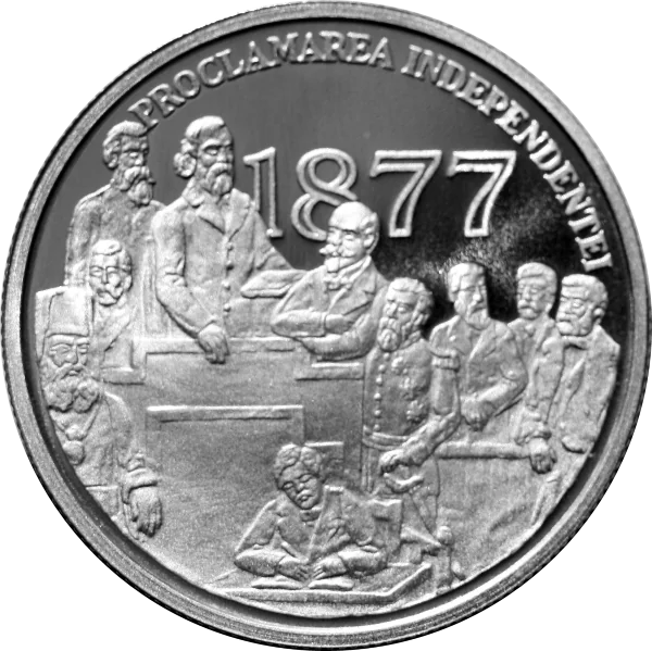 A scene of the Romanian Parliament proclaiming independence; above, the year 1877; circular inscription "PROCLAMAREA INDEPENDENTEI".