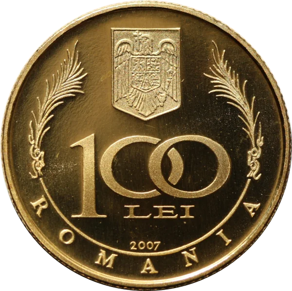 Central "100 LEI", Romania's coat of arms above, year "2007" and "ROMANIA" inscribed below.
