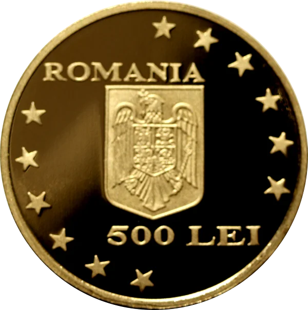 Center: Romania's coat of arms. Top: "ROMANIA". Bottom: "500 LEI". Encircling near the edge: the 12 stars of the EU.