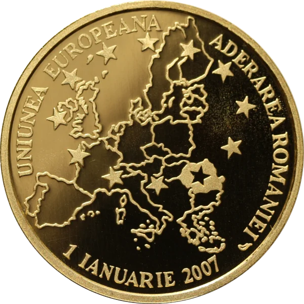 EU map with Romania highlighted; a star within Romania among the EU's 12 stars; circular text: "UNIUNEA EUROPEANA / ADERAREA ROMANIEI / 1 IANUARIE 2007".