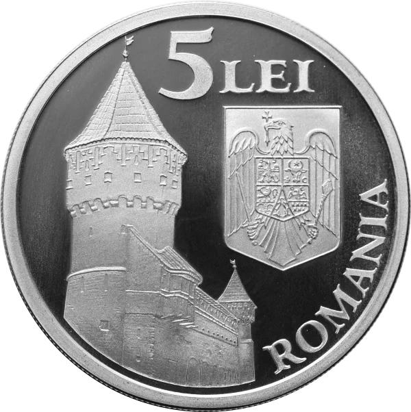 Left: Sibiu's Carpenters' and Potters' Towers with connecting wall. Right: Romania's coat of arms, "ROMANIA" inscription, and face value 5 LEI.