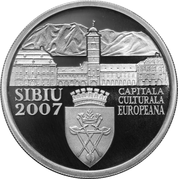 Lower: Sibiu's logo with "SIBIU 2007" to its left and "CAPITALA CULTURALA EUROPEANA" to its right. Middle: Four edifices—the Brukenthal Museum, City Hall's Tower with annex, House of Arts, and Luxembourg House. Upper: The Făgăraş Mountains.