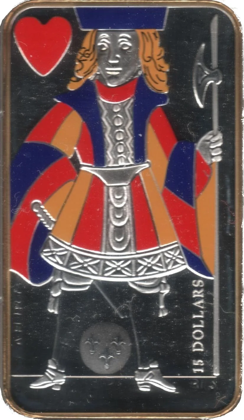 A reproduction of New France's "playing card money," based on a Canadian archives Jack of Hearts. Features color, selective gold plating, and a fleur-de-lis.