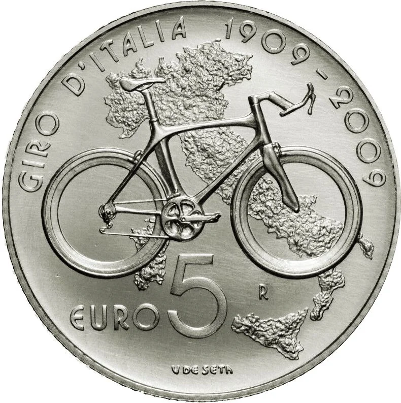 A racing bicycle in the foreground with a map of Italy in the background. Below are the value, mint mark, and author's name.