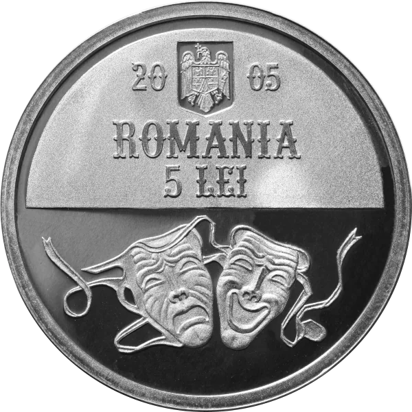 Upper: "2005", "ROMANIA", and "5 LEI". Lower: the masks of Comedy and Tragedy.