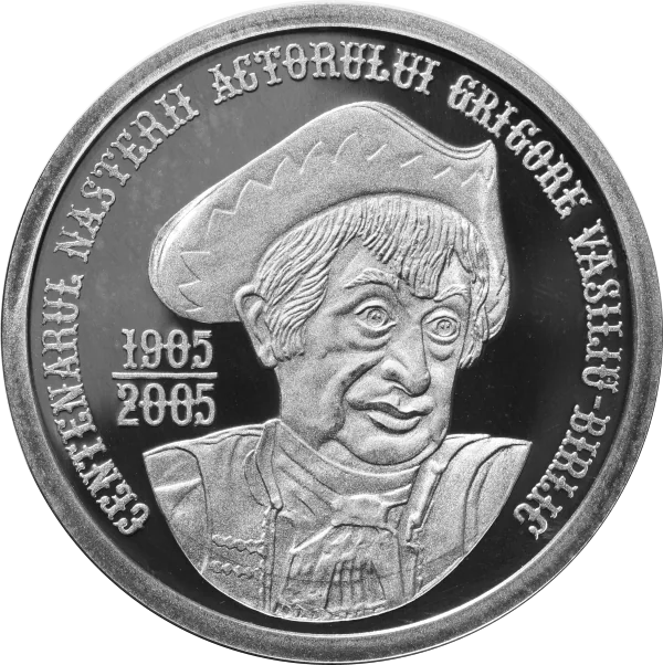 A bust of actor Grigore Vasiliu-Birlic in a comedic role, encircled by the inscription "CENTENARUL NAȘTERII ACTORULUI GRIGORE VASILIU-BIRLIC". The years 1905 and 2005 are stacked to the left of the bust.